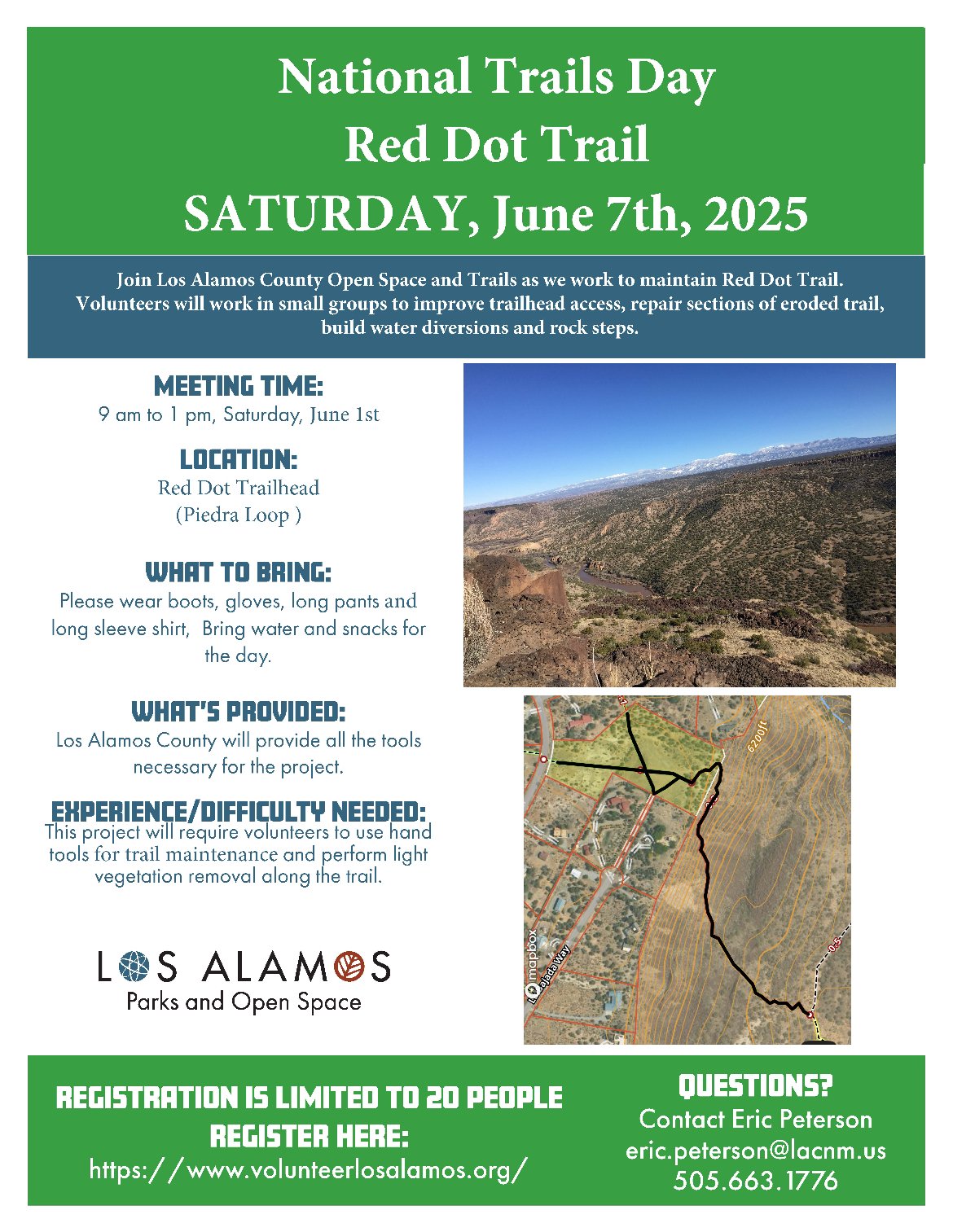 Join Los Alamos County Open Space and Trails as we work to maintain Red Dot Trail. Volunteers will work in small groups to improve trailhead access, repair sections of eroded trail, build water diversions and rock steps.