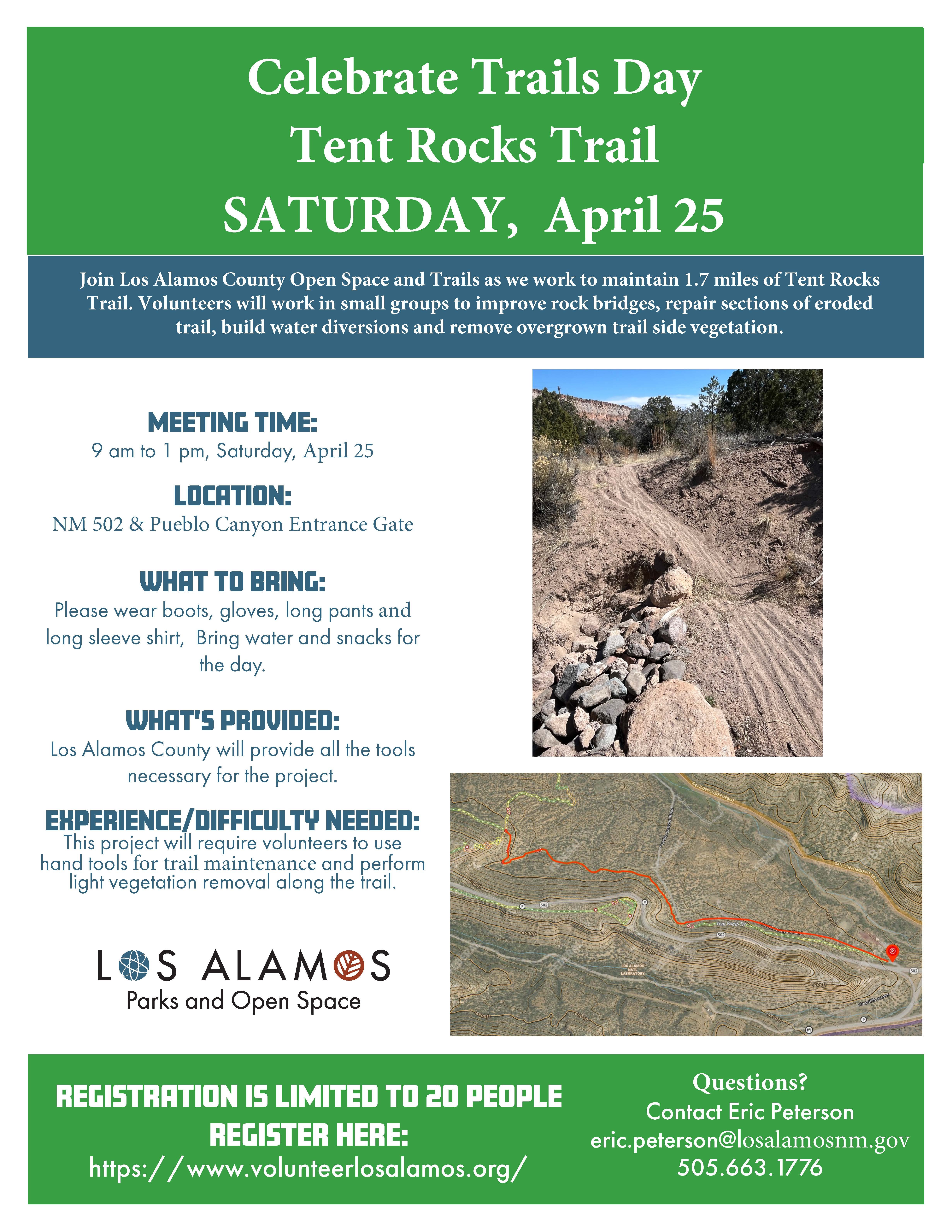 Join Los Alamos County Open Space and Trails as we work to maintain 1.7 miles of Tent Rocks Trail. Volunteers will work in small groups to improve rock bridges, repair sections of eroded trail, build water diversions and remove overgrown trail side vegetation.