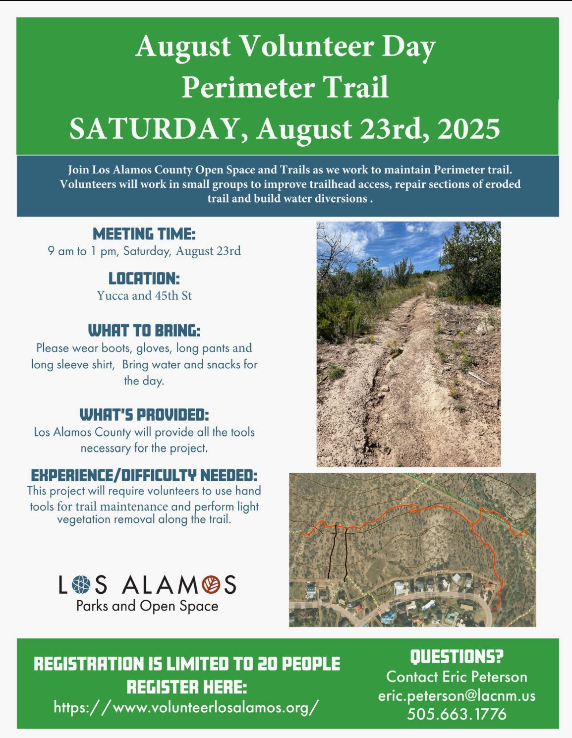 Join Los Alamos County Parks and Open Space as we work to maintain Perimeter Trail. Volunteers will work in small groups to improve trailhead access, repair sections of eroded trail and build water diversions.